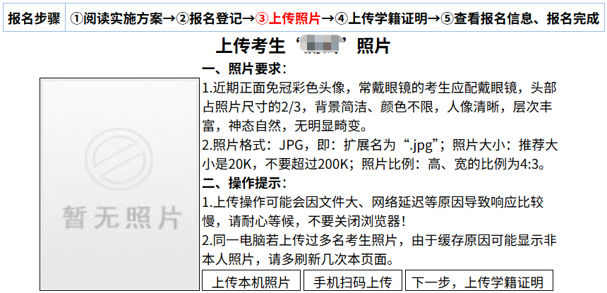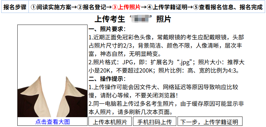 注意:由于服务器、浏览器等缓存的原因,照片上传完成后,若不显示考生照片或显示非本人照片,请多刷新几次本页面。