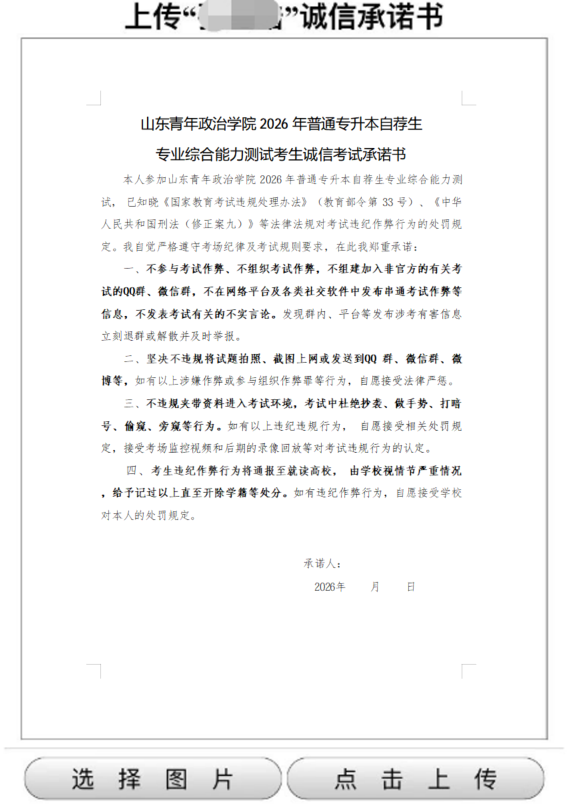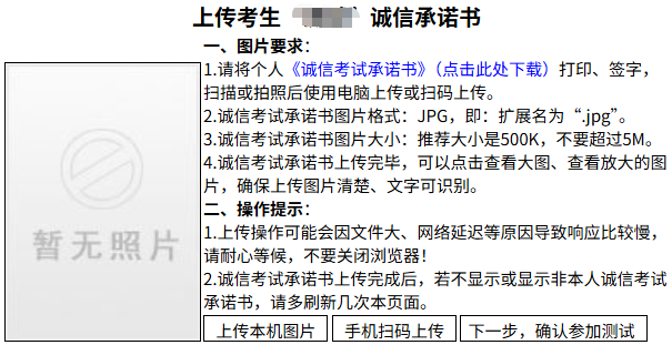 注意:由于服务器、浏览器等缓存的原因,诚信承诺书图片上传完成后,若不显示或显示非本人诚信承诺书,请多刷新几次本页面。