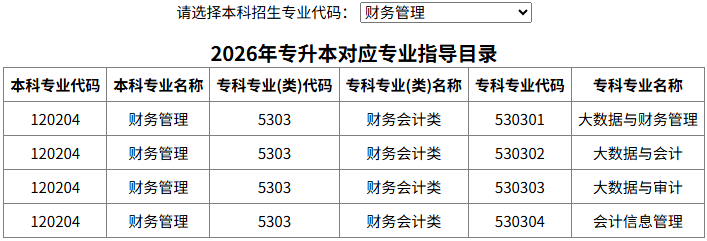 这里可以点击“步骤2:填写报考信息,专业对应专业类可参阅专升本对应专业指导目录(点击查看)”的“点击查看”打开“专升本对应专业指导目录”查看页面,选择某一本科专业查看其对应的专科专业。以报考“财务管理”专业为例,其对应的专科专业类和专业如下图: