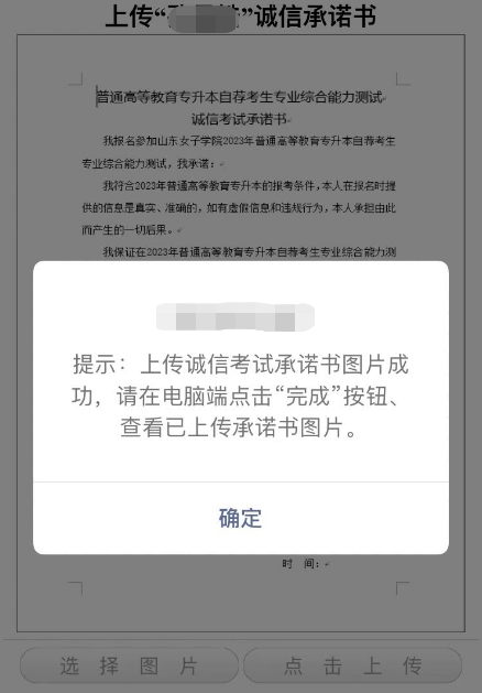 点击“点击上传”按钮,系统提示:上传诚信考试承诺书图片成功,请在电脑端点击“完成”按钮、查看已上传承诺书图片。如下图: