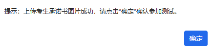 这里可以点击“《诚信考试承诺书》(点击此处下载)”下载空白诚信考试承诺书。点击“上传本机图片”选择本机考生承诺书图片、系统自动上传,稍后系统提示:上传考生承诺书图片成功,请点击“确定”确认参加测试。如下图: