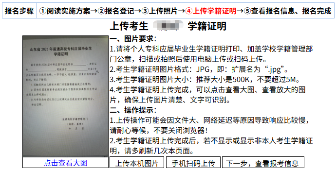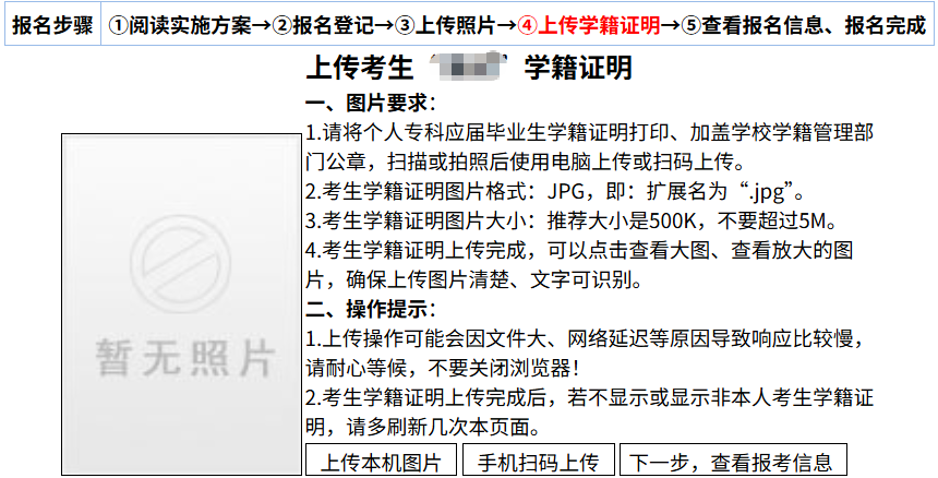 注意:由于服务器、浏览器等缓存的原因,学籍证明图片上传完成后,若不显示或显示非本人证明图片,请多刷新几次本页面。