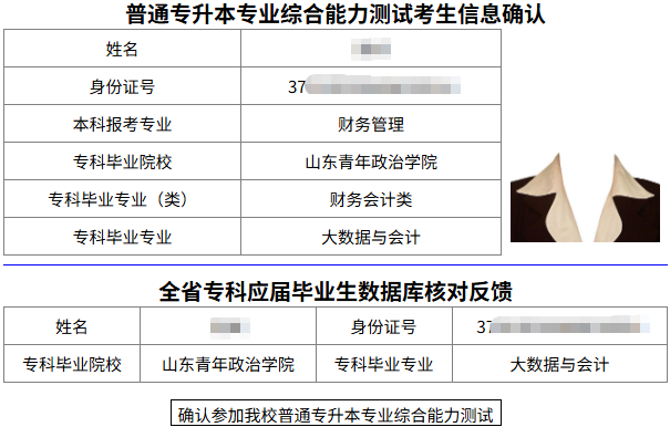 二、确认页面上半部分是考生报考信息,下半部分是全省专科应届毕业生数据库核对反馈信息。