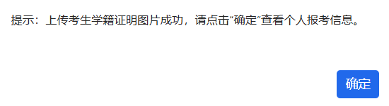 点击“上传本机图片”选择本机考生学籍证明图片、系统自动上传,稍后系统提示:上传考生学籍证明图片成功,请点击“确定”查看个人报考信息。如下图: