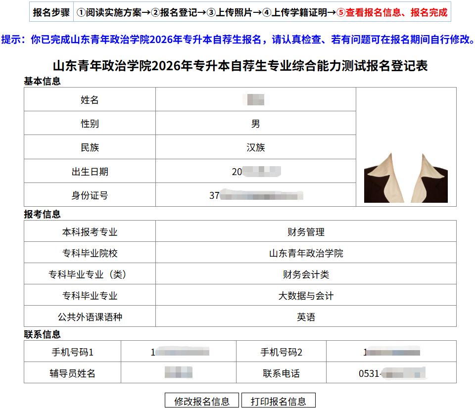 如已按要求上传考生照片和学籍证明后,系统显示:你已完成山东青年政治学院2026年专升本自荐生报名,请认真检查、若有问题可在报名期间自行修改。