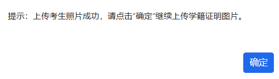 点击“上传考生照片”选择本机考生照片、系统自动上传,稍后系统提示:上传考生照片成功,请点击“确定”继续上传学籍证明图片。如下图: