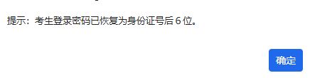 点击“确定”,系统提示:考生密码已恢复为身份证号后6位。点击“确定”使用新密码登录系统、并自行修改密码,如下图: