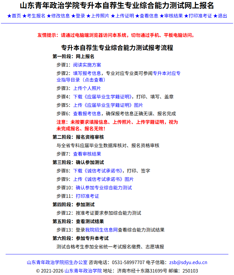 整个操作界面以两条横线分为上、中、下三部分,最上边是操作菜单,最下边是山东青年政治学院招办联系方式,中间部分是主要操作区域。主页也以简洁的形式,告诉考生参加山东青年政治学院普通专升本专业综合能力测试报考流程。