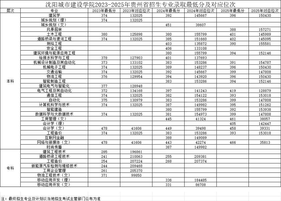 贵州2023-2025年招生专业录取最低分数线及对应位次