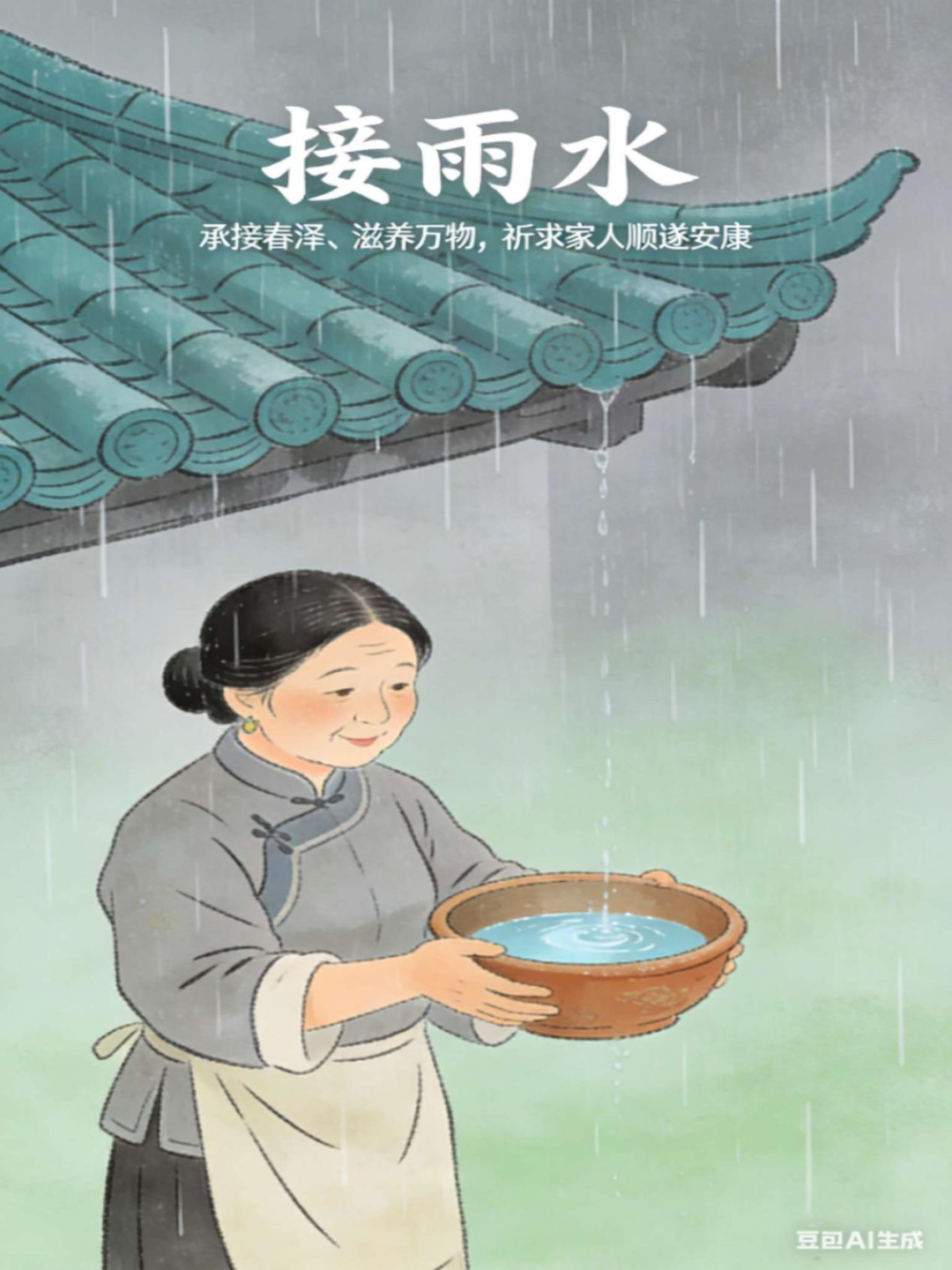 民间多地流行“接雨水”,即承接天降雨水珍藏,寓意承接春泽、滋养万物,祈求家人顺遂安康。
