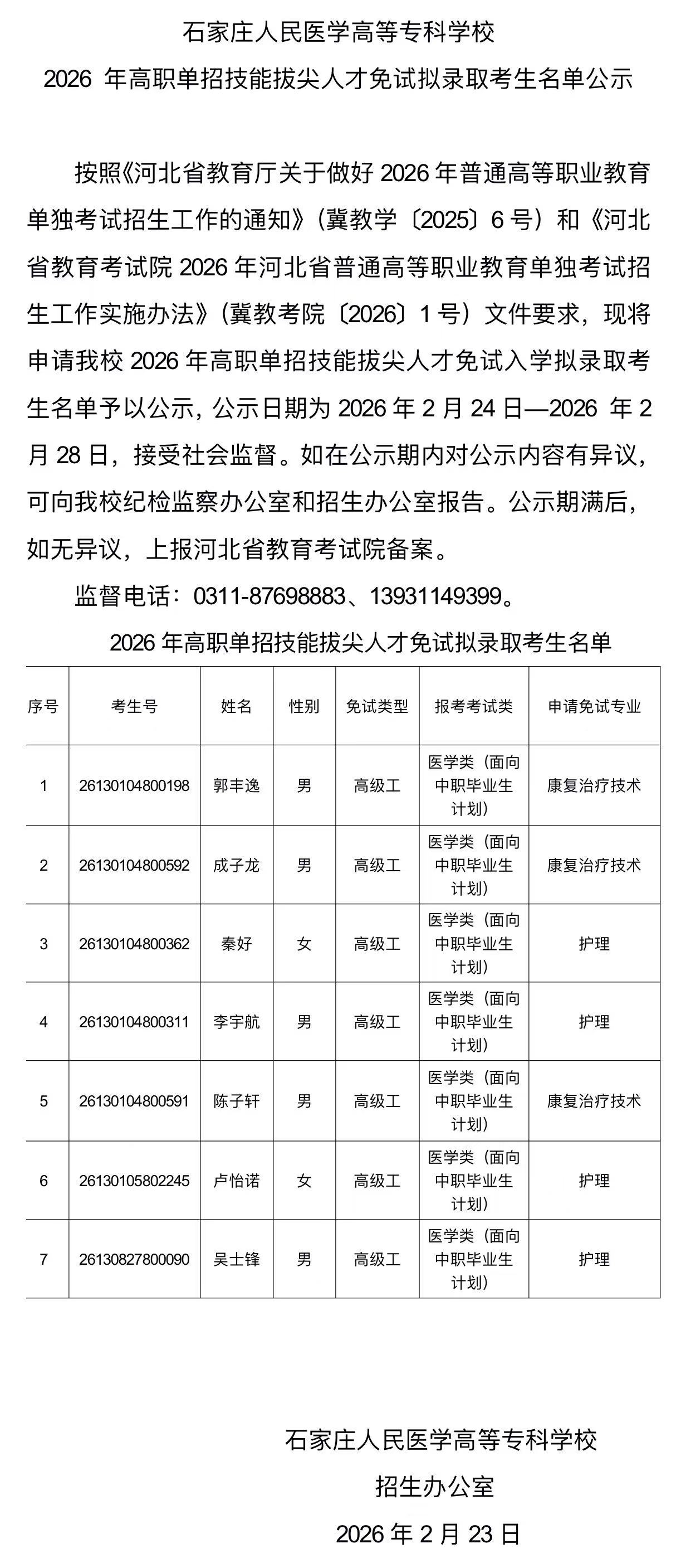 石家庄人民医学高等专科学校 2026年高职单招技能拔尖人才免试拟录取考生名单公示