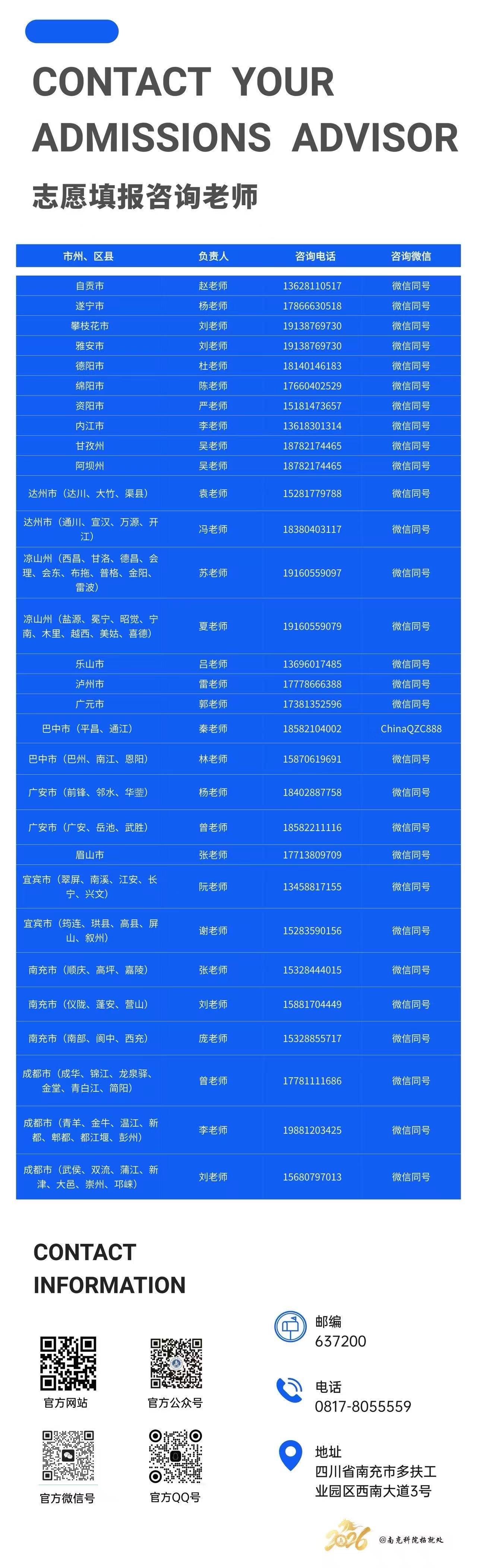 南充科院2026年各地市州招生咨询联系方式