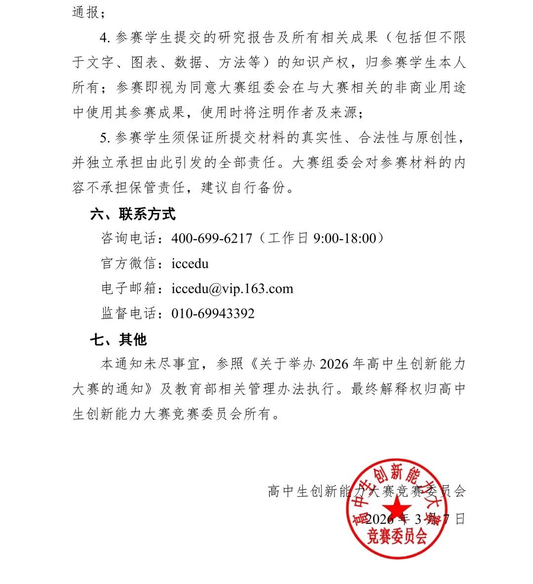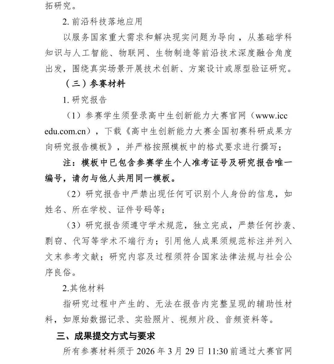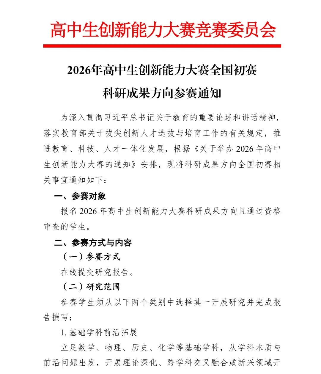 2026年高中生创新能力大赛全国初赛科研成果方向参赛通知