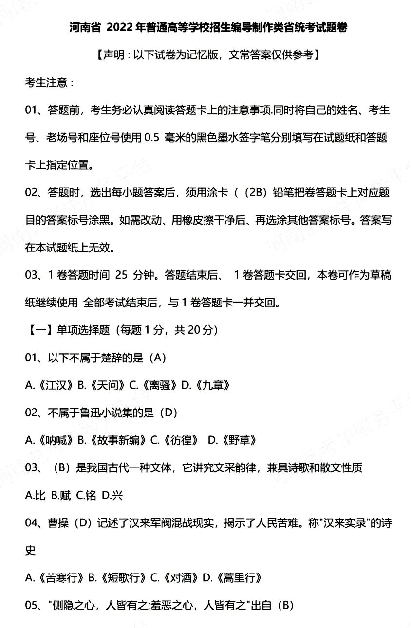 2022年河南编导联考/统考考题(编导制作)