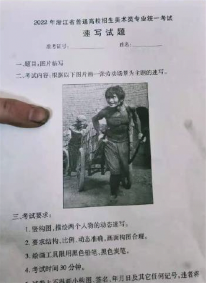 一、题目:图片临写二、考试内容:根据以下图片画一张劳动场景为主题的速写三、考试要求:1、竖构图,描绘两个人物的动态速写;2、要求结构、比例、动态准确,画面构图合理;3、绘画工具限黑色铅笔、黑色炭笔;4、考试时间30分钟。