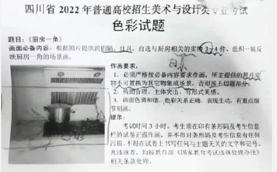色彩考题:《厨房一角》,根据照片提供的铝锅、灶具,自选与厨房相关的实物3-4件,组织一幅反映厨房一角的场景画。