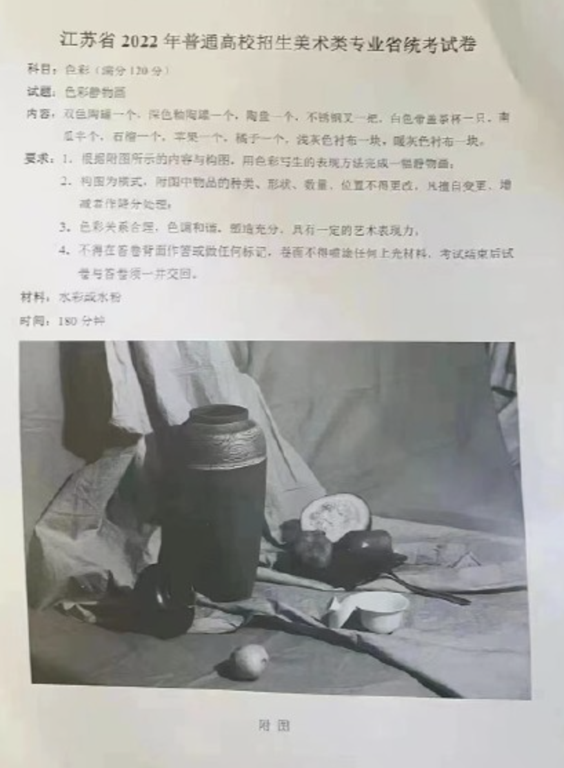 1.考试题目:静物组合,双色陶罐1个,深色釉陶罐1个,陶盘1个,不锈钢壶1把,白色带盖茶杯1个,南瓜半个,石榴1个,苹果1个,浅灰色衬布一块,暖灰色衬布1块。