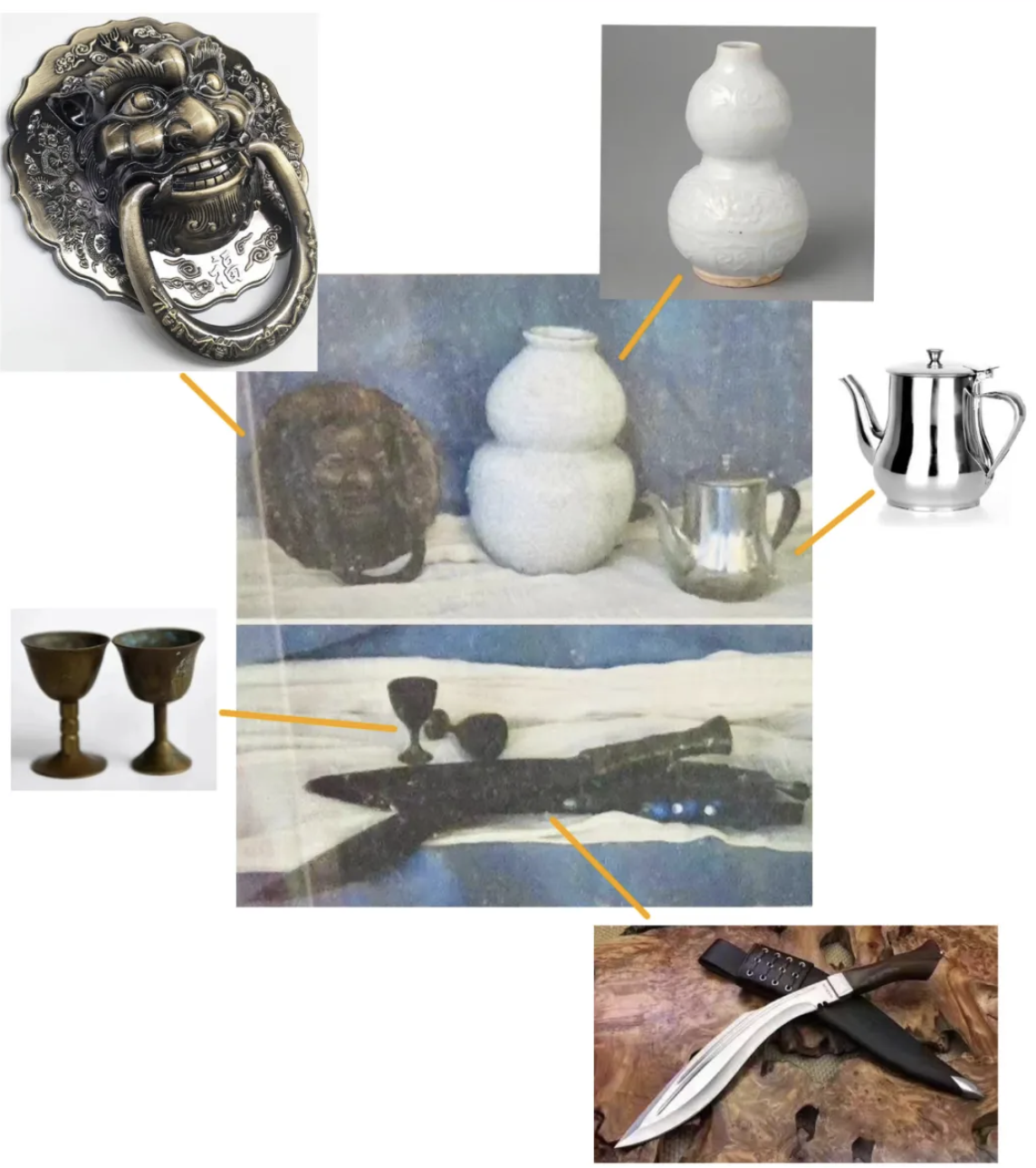 考试题目:静物组合,照片模拟写生,门环、葫芦、不锈钢、铜杯、刀、刀鞘等静物。