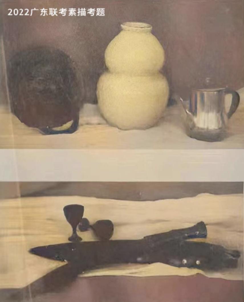 考题解析:虽然考题中的静物大多是不常见的冷门静物,但是整体来说难度不是很大,主要是区分各类静物的质感,茶壶是不锈钢的,门锁应该是铜的,罐子是瓷器,而酒杯和刀应该是青铜的,把这些质感的区别画出来拿到高分就不是什么难事。