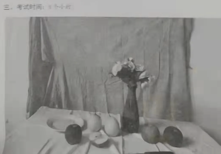 考题内容∶静物组合,色彩蓝色罐子花束,四个苹果两个梨。
