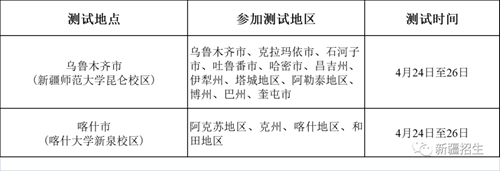自治区2023年普通高等学校招生体育类专业测试(以下简称“体育测试”)工作将于4月24日至26日在乌鲁木齐市、喀什市两个测试点进行。网上报名和缴费工作于2023年4月8日10时开始,4月14日16时结束,报考2023年体育测试考生请勿错过。