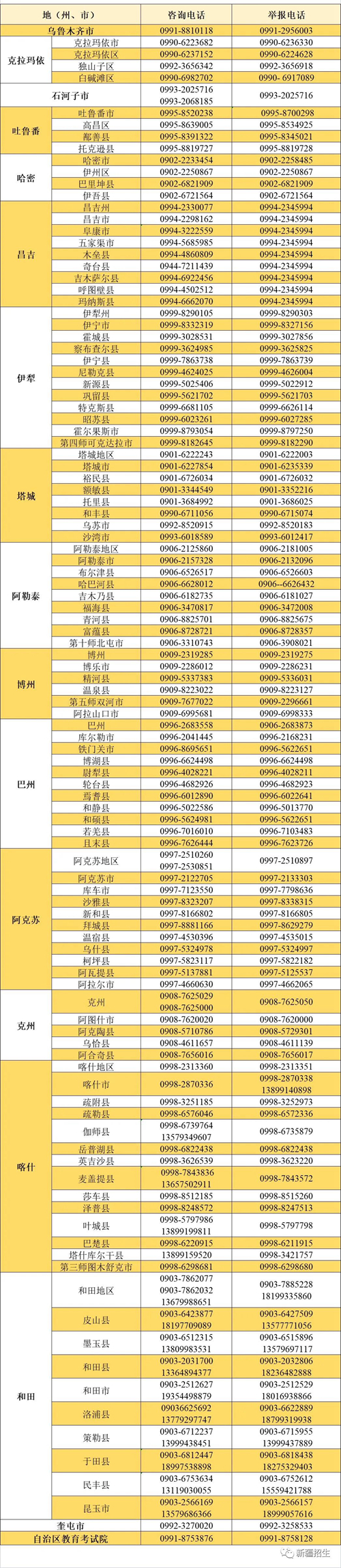 考生可登录“新疆招生网”查看《关于印发〈自治区2023年普通高等学校招生体育类专业测试工作方案〉的通知》,详细了解我区2023年普通高等学校招生体育类专业测试报考条件及相关要求,按时按要求完成网上报名。考生如有疑问,可拨打当地教育考试机构咨询电话(详见下表)咨询。