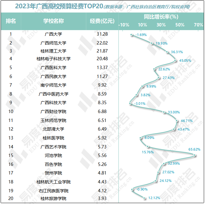 全区共有6所院校2023年的预算经费破10亿,区内唯一的“211”兼“双一流”院校