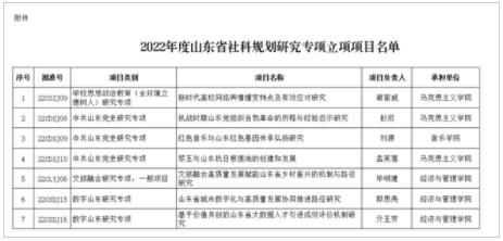 近日,山东省哲学社会科学工作办公室正式公布2022年度山东省社科规划研究专项立项项目名单,齐鲁师范学院共有7项课题获准立项。在本年度全省申报总数增加158项而立项总数减少88项的情况下,立项数量较上一年度增加3项,立项率增长11%,立项总数位居同类高校前列。近年来,学校党委行政高度重视学科建设工作,全面推进科研提质;科研处高度重视项目的培育和组织遴选,协同学院严把申报材料的政治方向关和学术质量关,确保项目立项率和立项质量。今后,学校将继续加强高层次项目培育,锚定硕士学位授予单位申报条件建设这一总目标,全面提升科研竞争力,力争再创佳绩,全力推进学校内涵式高质量发展。立项名单见附件: