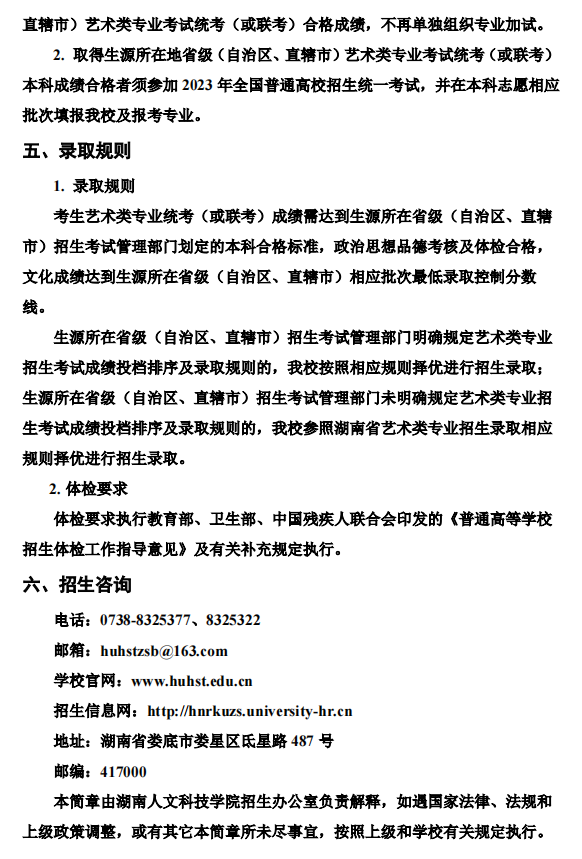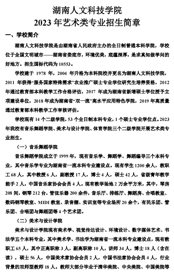 湖南人文科技学院2023年艺术类专业招生简章