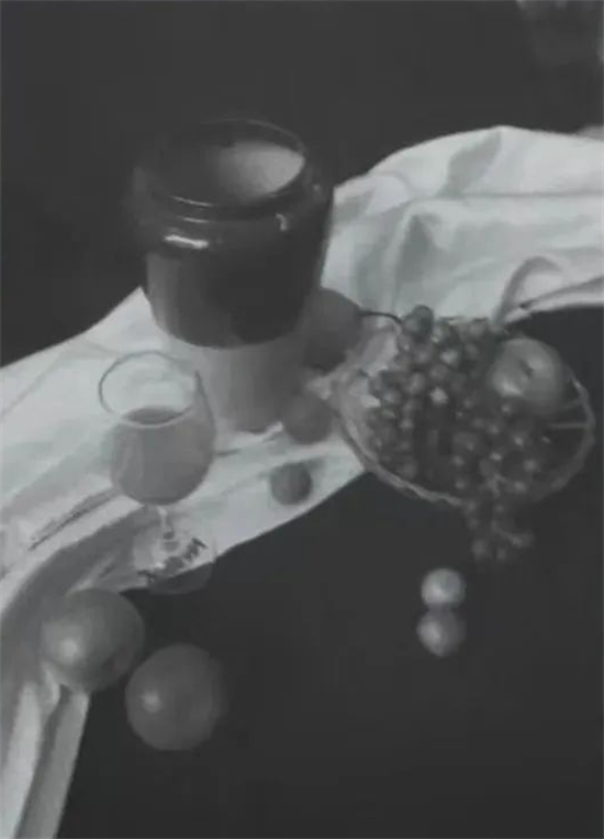 半釉陶罐一个、红酒杯一个、玻璃盘一个、苹果两个、桔子两个(其中小金桔一个)、梨子一个、青枣三个、葡萄两串(红色、绿色各一串)、衬布(黑色、白色各一张)共两张。