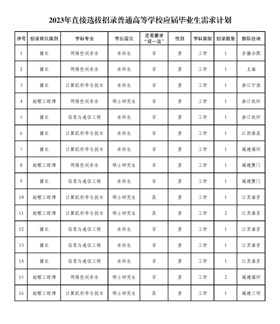 为深入贯彻习近平总书记关于军民融合发展重大战略思想,推动军地合力培育军事人才,现将信息通信部队某部2023年直接选拔招录普通高等学校应届毕业生有关事项公告如下: