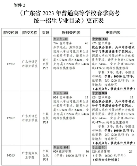 应有关高校要求,现对《广东省2023年普通高等学校春季高考统一招生专业目录》部分内容作如下更正(见附件),请及时转发各中学并告知学生。