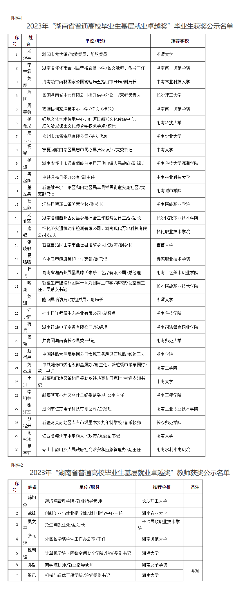根据《关于开展2022年“全国高校毕业生基层就业卓越奖”推荐活动的通知》《关于开展2023年“湖南省普通高校毕业生基层就业卓越奖”推荐活动的通知》要求,经高校推荐、专家评审、“基层就业卓越奖”评审委员会审定,共评选出“湖南省普通高校毕业生基层就业卓越奖”高校毕业生30人、
