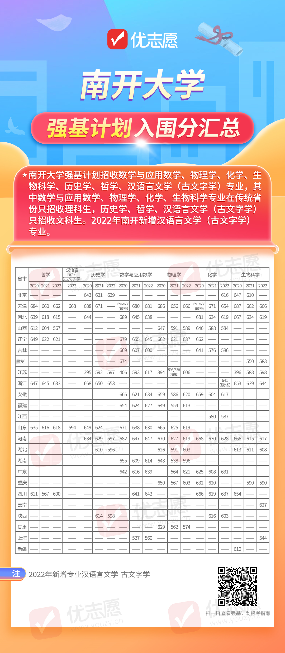近日各高校强基计划招生简章陆续发布中,为了帮助考生更好地选择院校与专业,小优为大家汇总了南开大学近3年的入围分,大家可以根据历年数据与自身情况进行报考。注:如果高校在该省份当年没有招生或者没有公布入围分数线将用“—”表示。