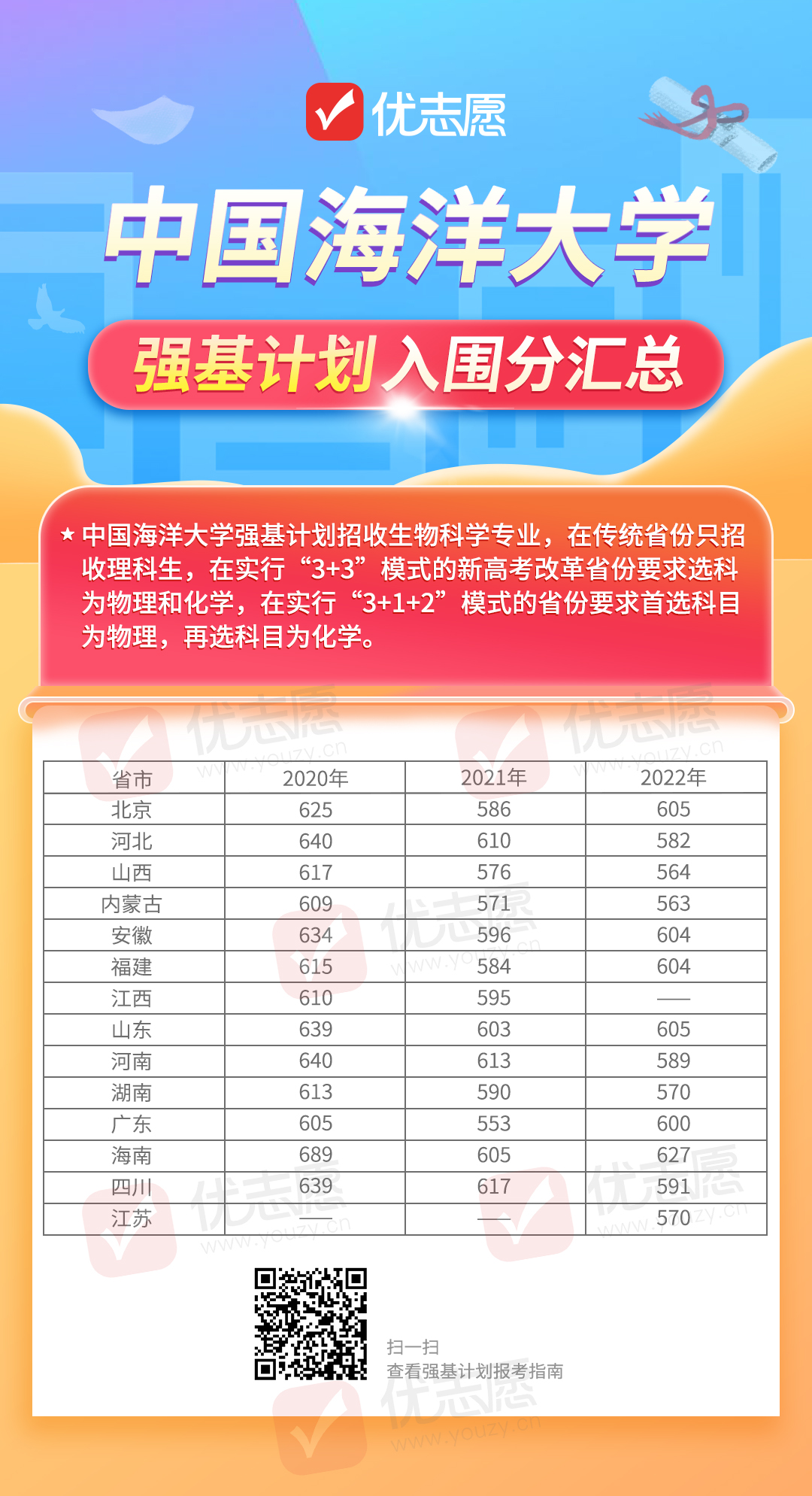 近日各高校强基计划招生简章陆续发布中,为了帮助考生更好地选择院校与专业,小优为大家汇总了中国海洋大学近3年的入围分,大家可以根据历年数据与自身情况进行报考。注:如果高校在该省份当年没有招生或者没有公布入围分数线将用“—”表示。