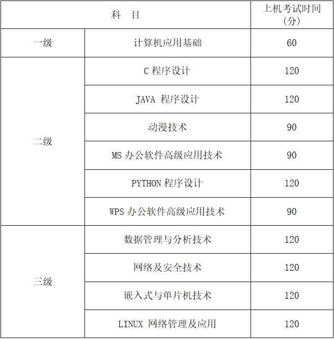 高校计算机等级考试分为三个等级,所有级别科目均实行上机考试。具体考试时间以考生本人准考证上的时间为准,各级别科目考试时长如下: