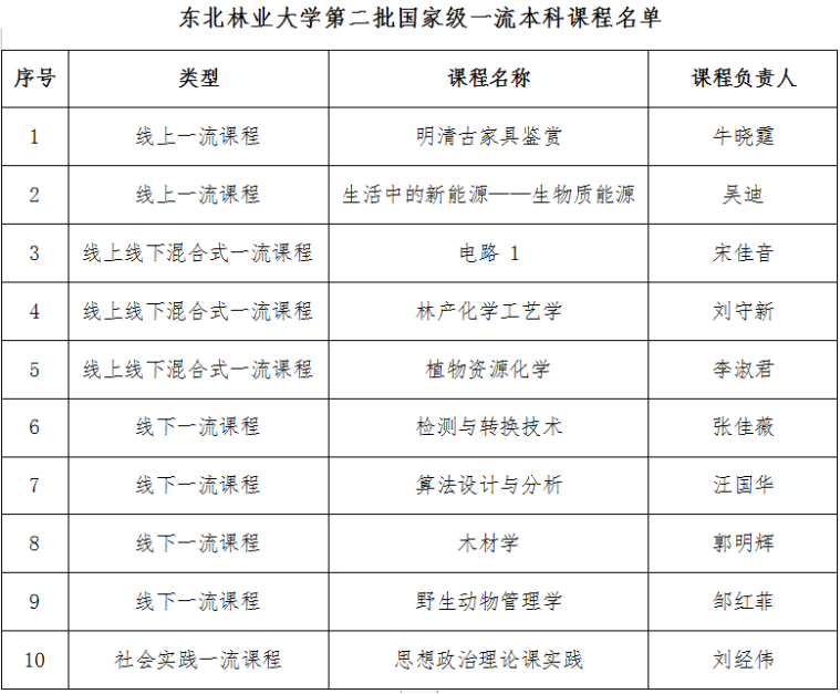 近年来,我校深入贯彻落实教育部关于一流本科课程建设的实施意见。发布了《东北林业大学一流本科课程建设实施方案》,高位推进落实立德树人根本任务,深度推进教育内涵发展,持续推进课程改革创新,建设了一批具备高阶性、创新性、挑战度的一流本科课程。包括国家级一流本科课程23门,省级一流本科课程58门,校级一流本科课程165门,形成多类型、多样化的教学内容与课程体系,持续提升我校课程建设水平和人才培养质量。