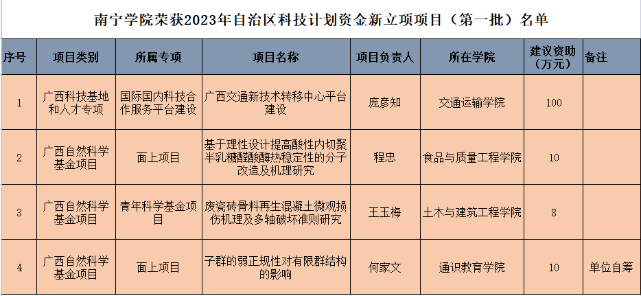 2023年5月6日,经自治区人民政府审议同意,根据《广西壮族自治区财政厅关于同意2023年自治区本级财政科技计划第二批项目安排的函》(桂财教函〔2023〕82号),《自治区科技厅关于下达2023年自治区科技计划资金新立项项目(第一批)的通知》(桂科计字〔2023〕26号),广西科技厅下达了2023年自治区科技计划资金新立项项目(第一批)1515项;其中,