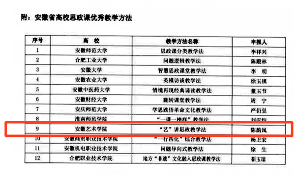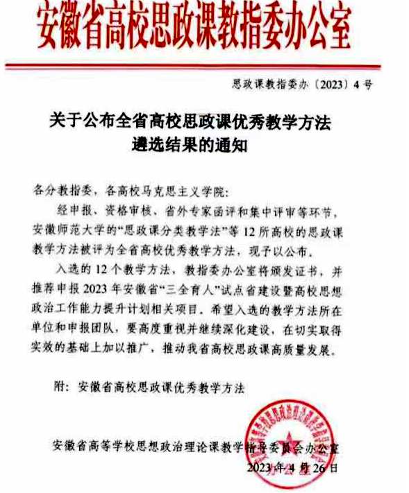 4月26日,安徽省高等学校思想政治理论课教学指导委员会公布全省高校思政课优秀教学方法遴选结果,