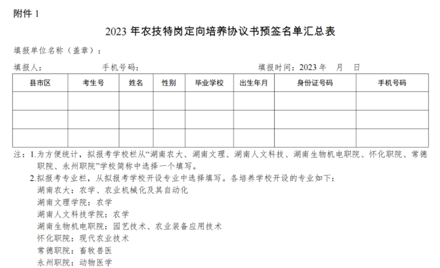 各县市区农业农村局在预签协议时间截止后5日内将预签了《协议书》的考生名单上报所在市州农业农村局,市州农业农村局汇总各县市区预签《协议书》考生名单电子档报送省农业农村厅科技教育处,纸质文件和电子档报送省农业技术推广总站。