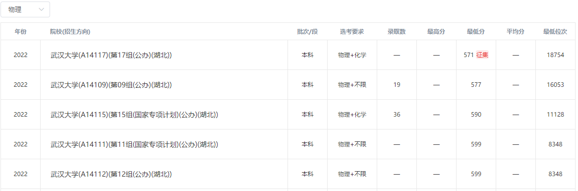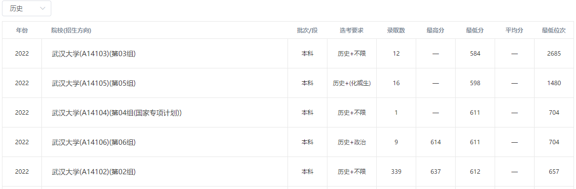 2022年武汉大学在本省录取分数线: