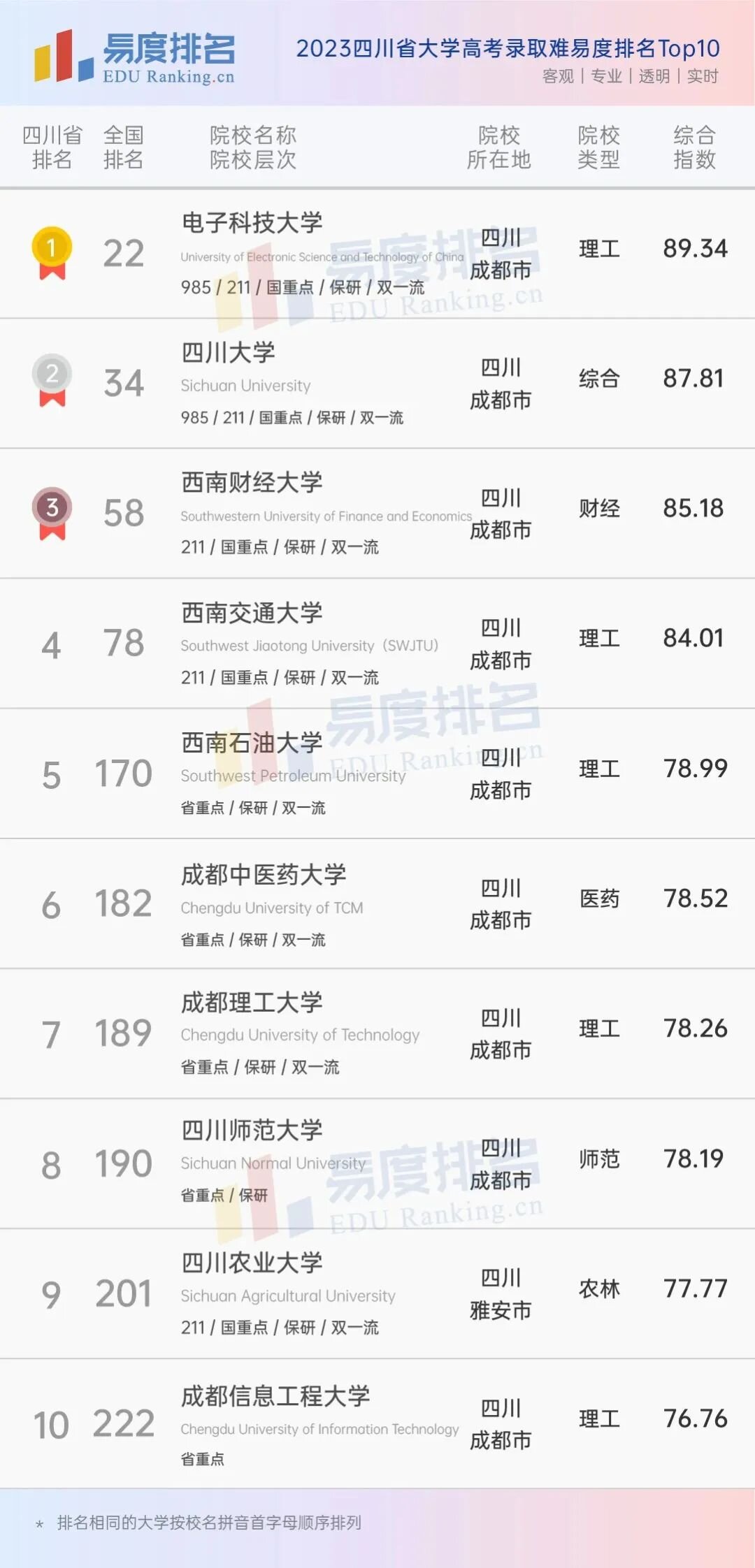 四川是中国非常有特色的省份,自古以来就是古蜀国的摇篮,目前也很发达,是一个经济中心和商业贸易中心,近几年的交通、医疗和教育方面都得到了很大的提升。本期易度排名将公布“2023四川省大学录取难易度排名”完整榜单,一起来了解这些大学的录取难度究竟如何。