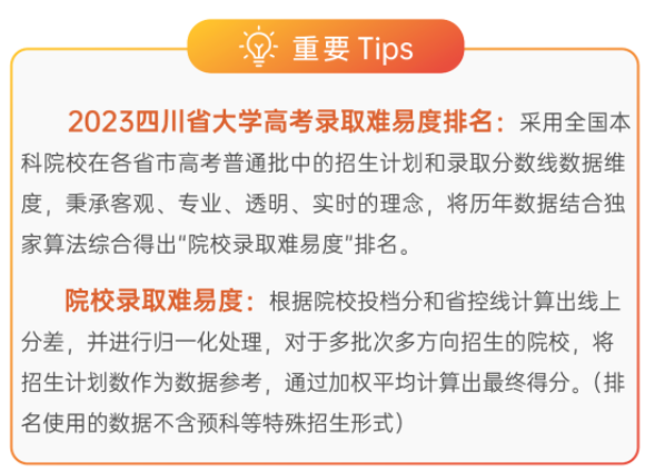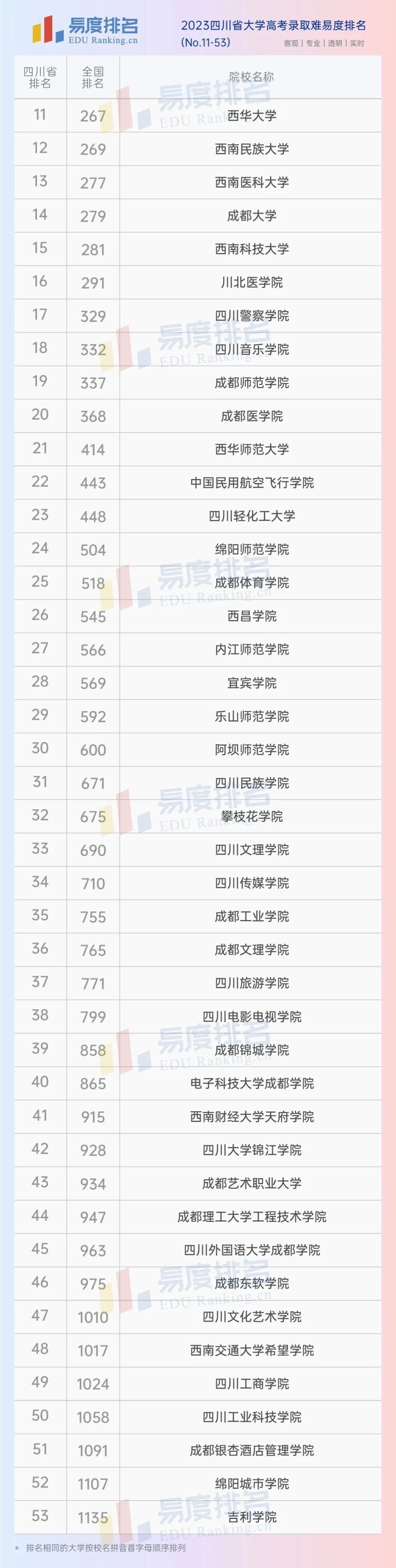 “2023四川省大学录取难易度排名”的对象是中国53所本科级院校。上榜的50多所院校中,985/211院校共5所,双一流院校共8所。