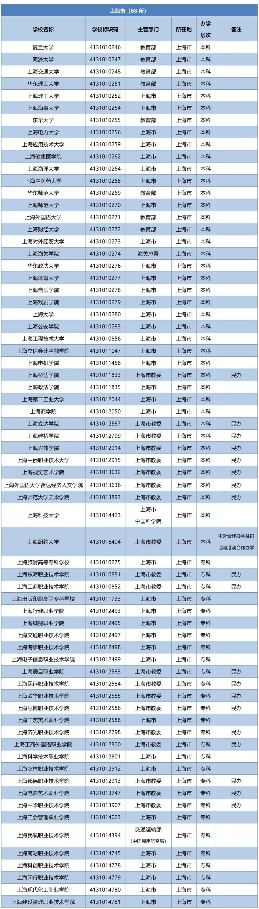 截至2023年6月15日,全国高等学校共计3072所,其中:普通高等学校2820所,含本科院校1275所、高职(专科)院校1545所;成人高等学校252所。本名单未包含港澳台地区高等学校。上海共68所普通高等学校,名单如下:
