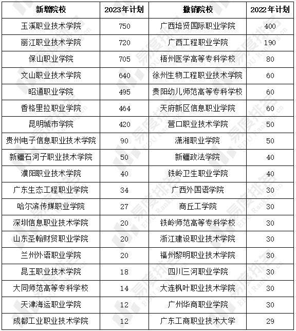表 1 2023年云南高考新增与撤销院校TOP20(专科普通类招生)