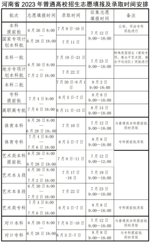 河南省2023年普通高校招生志愿填报及录取时间安排
