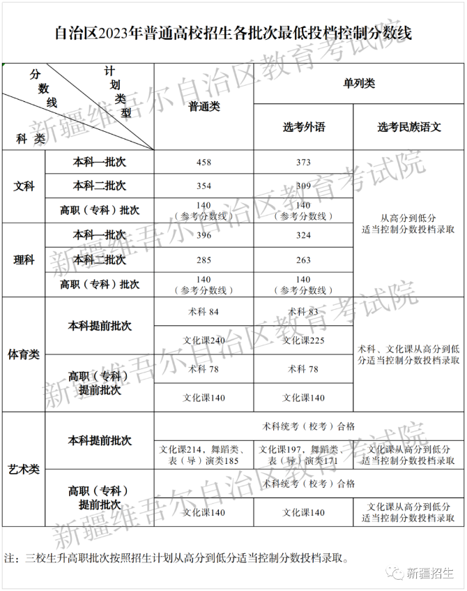 文章来源:新疆招生网 新疆2023年普通高校招生各批次最低投档控制分数线确定