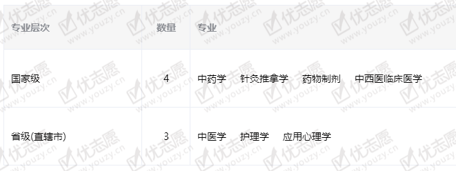 国家中医药管理局重点学科 | 针灸学、中医内分泌学、中医脑病学、中医血液病学、药用植物学、中医眼科学、中医耳鼻喉科学、中医护理学、中药药剂学、中医肛肠病学、中药化学、民族医学(苗医学)、民族药学(苗药学)、中西医结合临床、中医络病学、中医心理学、中医预防医学、中医药英语 |