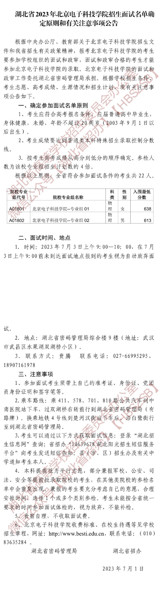 湖北省2023年北京电子科技学院招生面试名单确定原则和有关注意事项公告