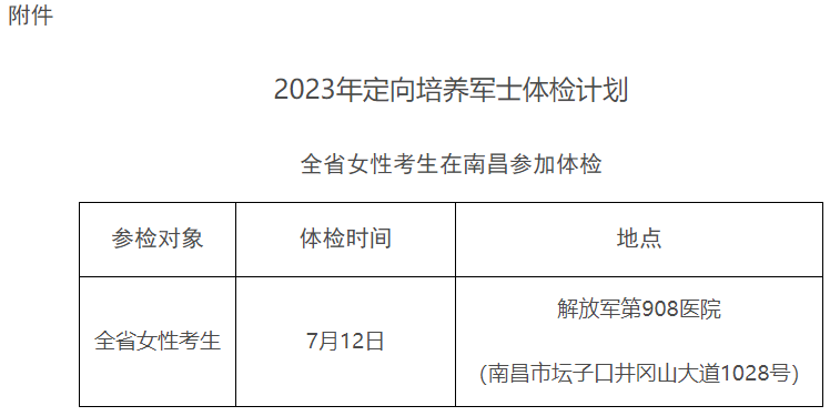由各设区市征兵办公室统一组织。其中,男性考生在报名地市参加,女性考生统一在南昌参加(具体安排见附表)。体检、政考结果于7月29日在江西省教育考试院网站(www.jxeea.cn)公布。